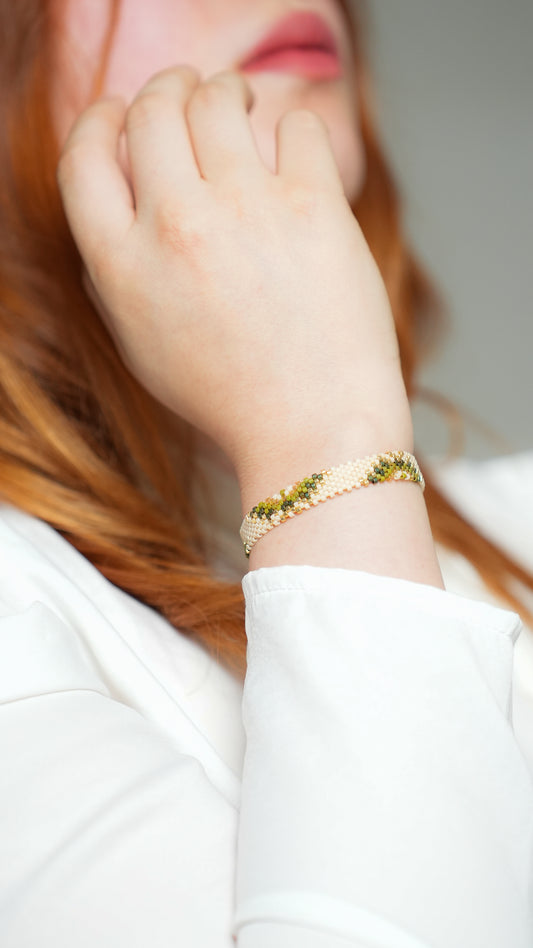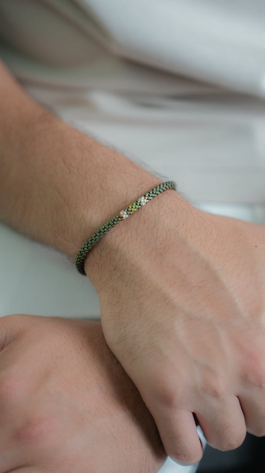 Pulsera Miyuki Caballero redonda verde militar centro olivo blanco
