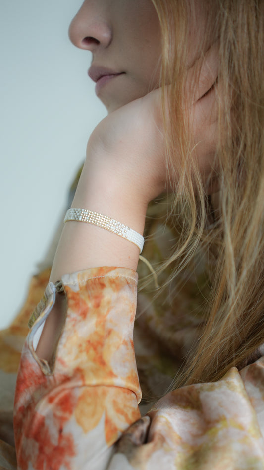 Pulsera Miyuki chica blanca lineas cruzadas negro dorado