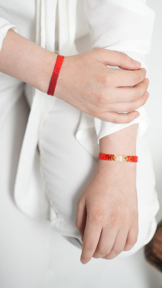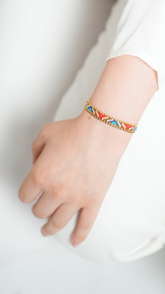 Pulsera Miyuki chica lineas doradas y triangulos rojo azul