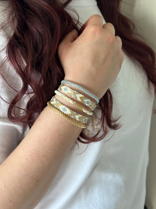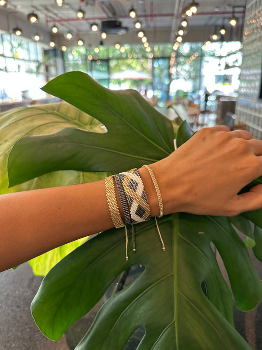 Pulsera Miyuki grande blanca lineas cruzadas negro oro