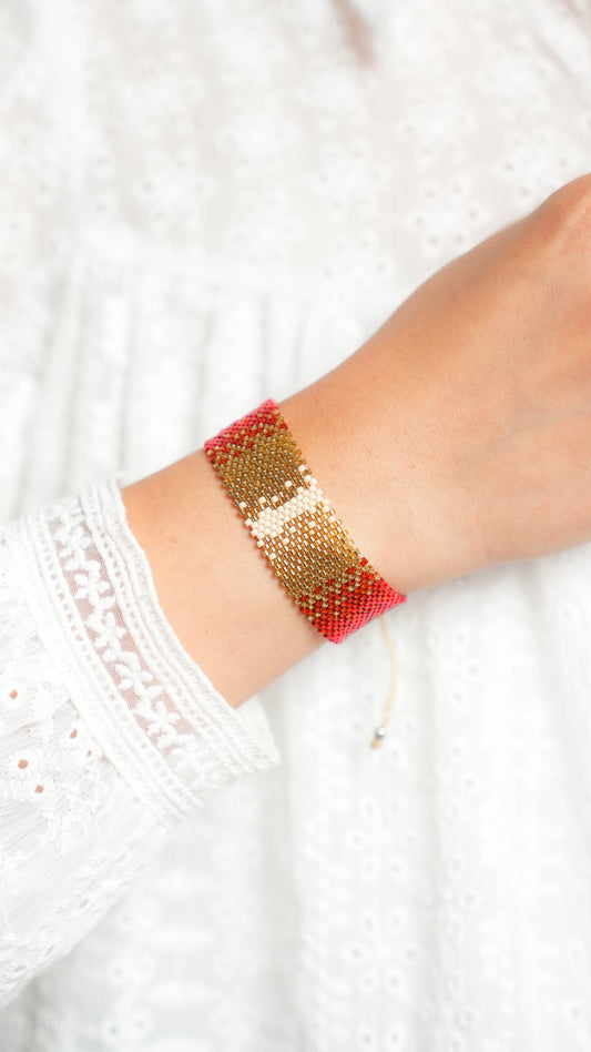 Pulsera Miyuki grande rojo lineas cruzadas, blanco y naranja