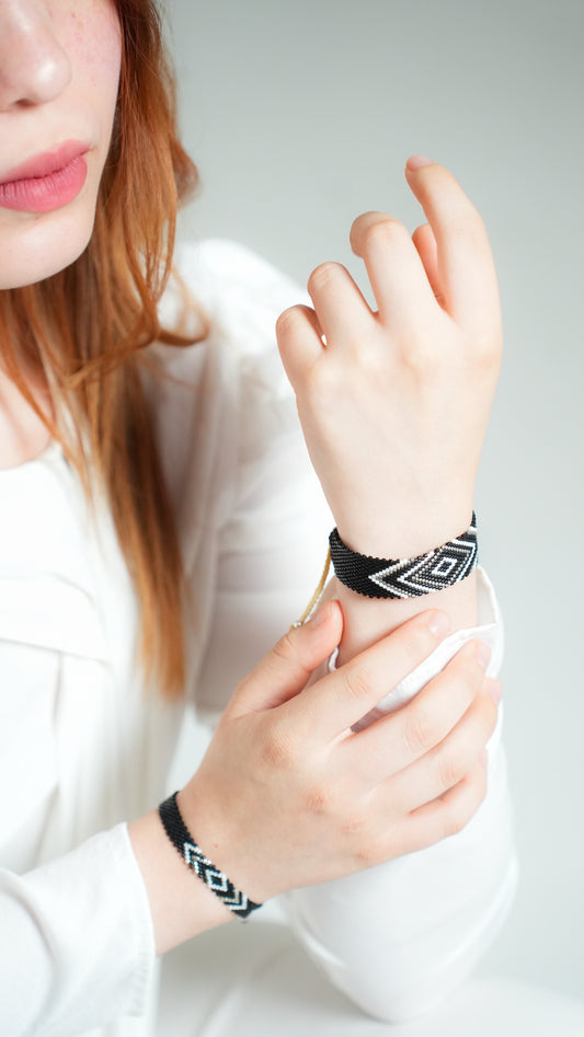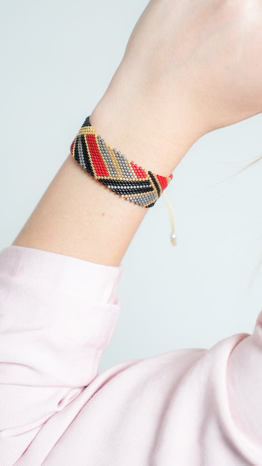 Pulsera Miyuki grande lineas doradas y grecas rojo azul