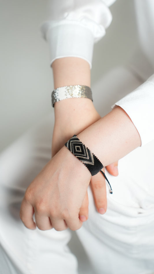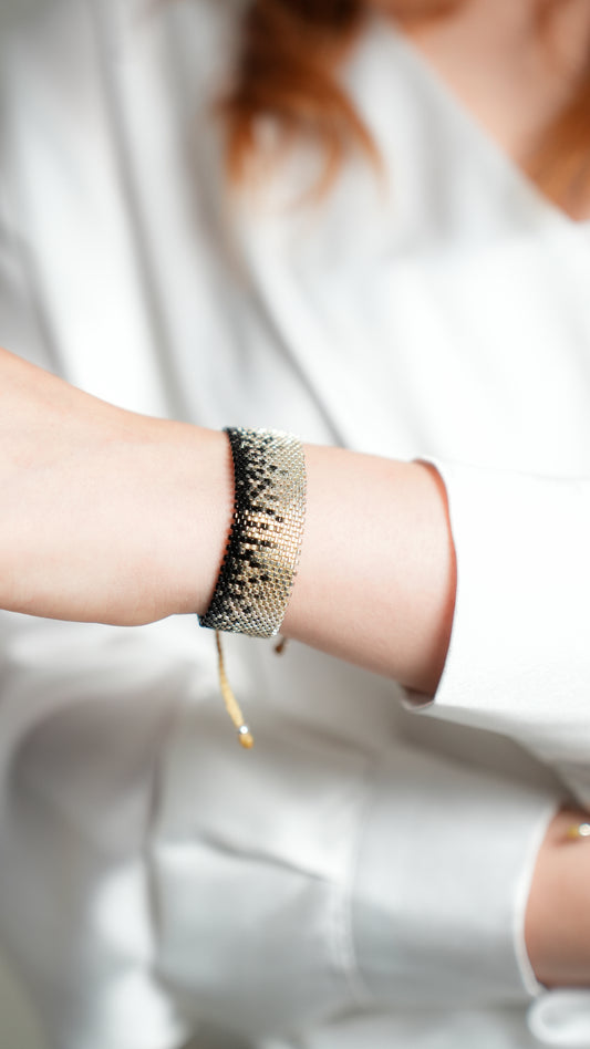 Pulsera Miyuki grande rombo colores lineas beige dorado