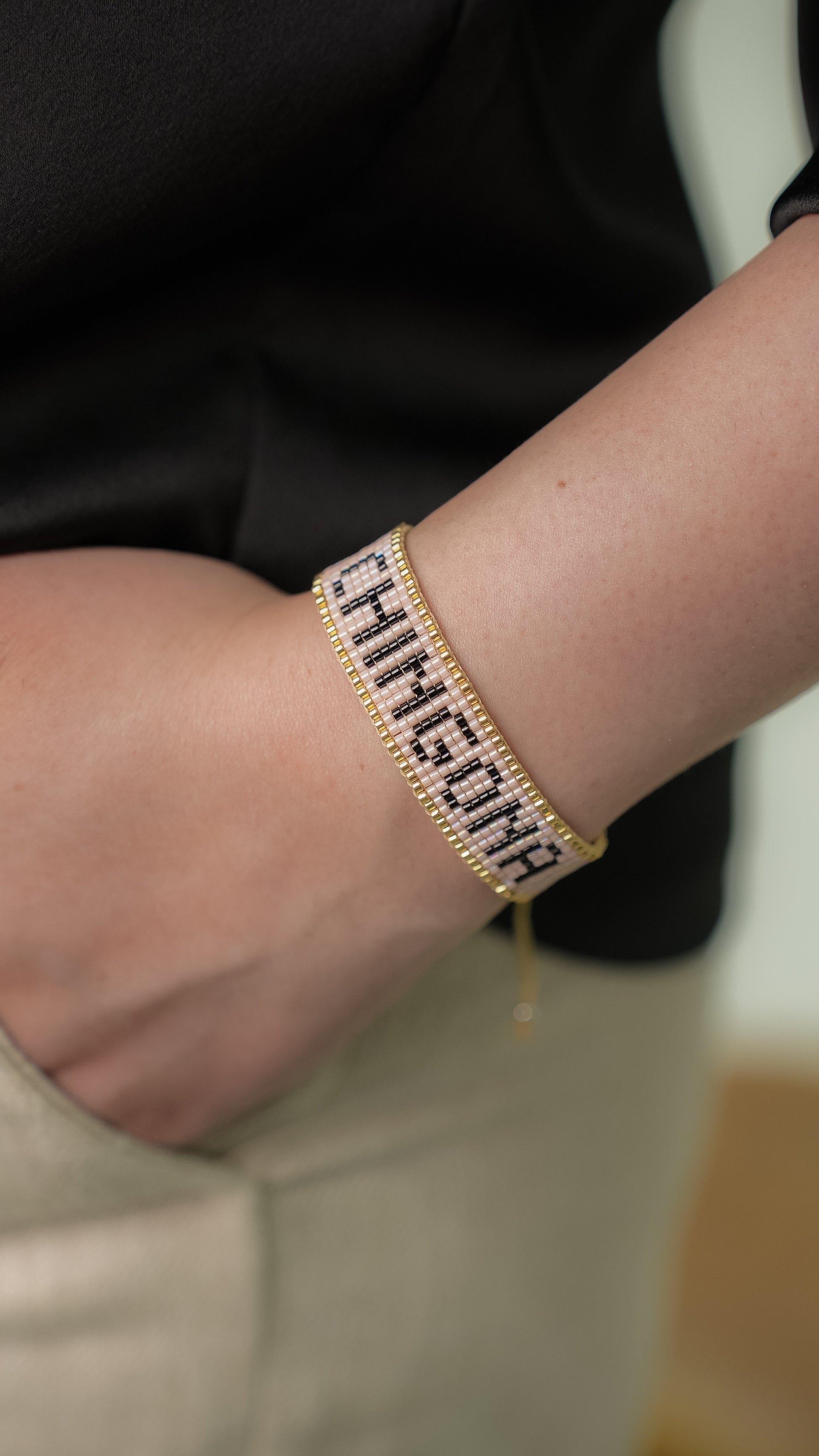 Pulsera tejida 100% a mano con Cristal Japones calidad PREMIUM e hilo italiano bondeado; terminado con broche ajustable a cualquier medida de muñeca y balines en plata en las puntas.
