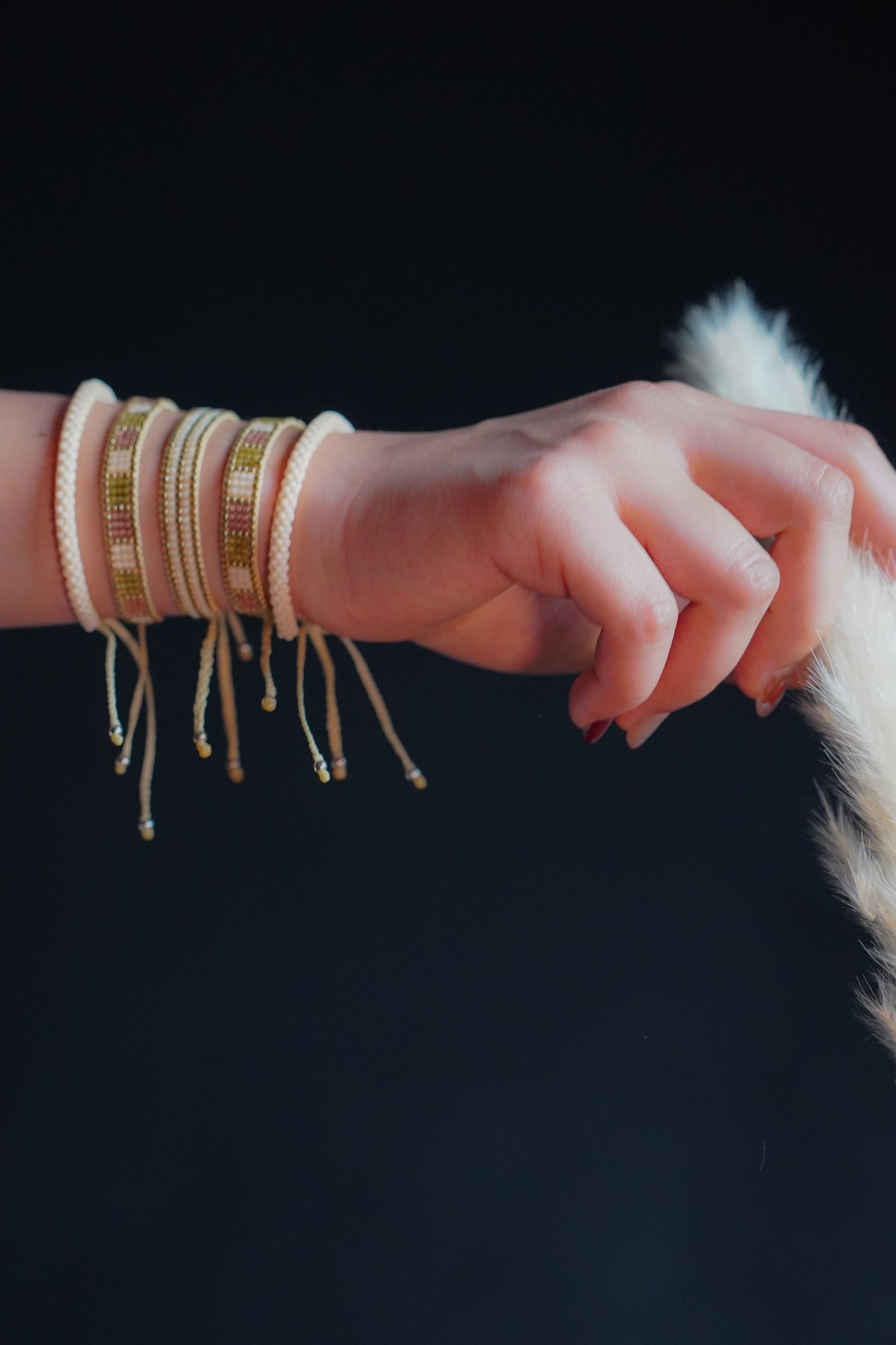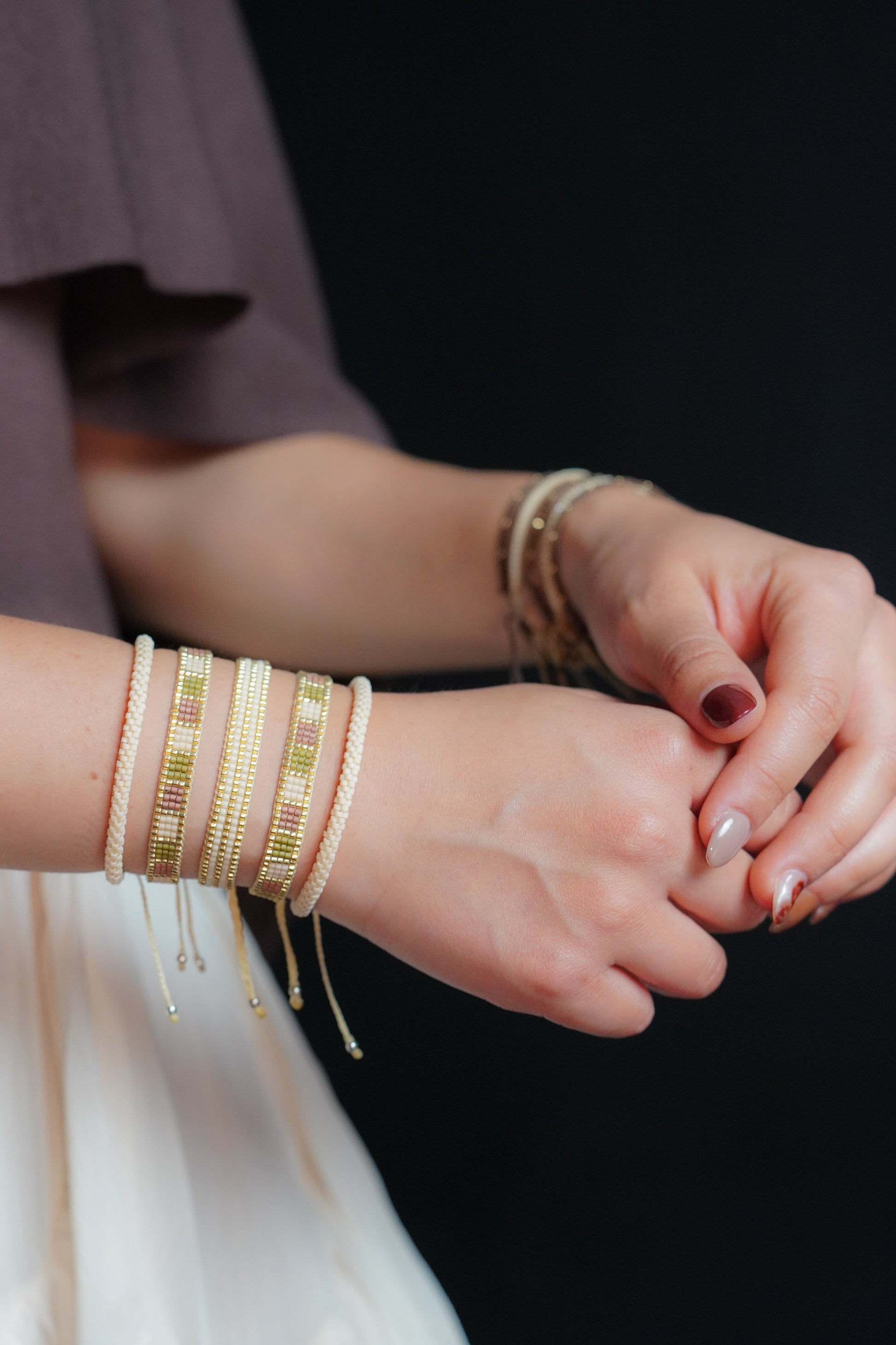 Pulseras tejidas 100% a mano con Cristal Japones calidad PREMIUM e hilo italiano bondeado; terminados con broche ajustable a cualquier medida de muñeca y balines en plata en las puntas.