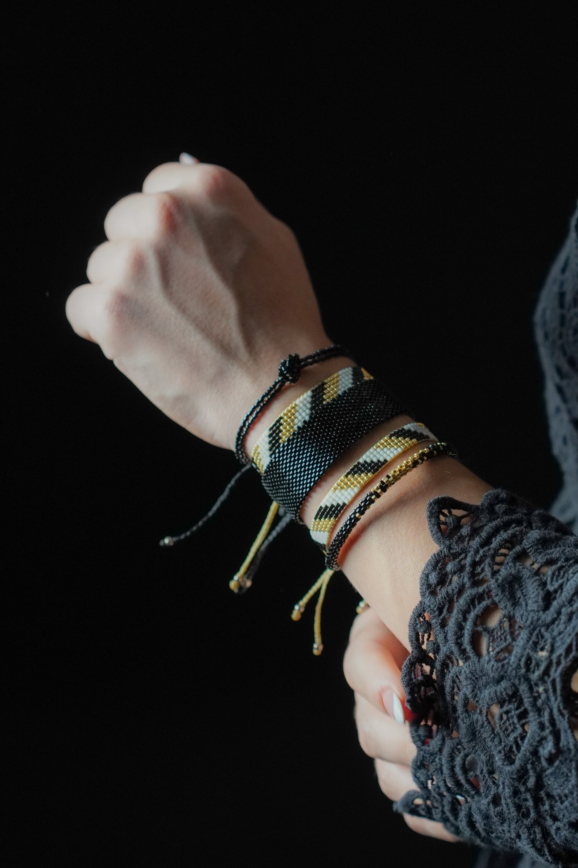 Pulseras tejidas 100% a mano (técnica peyote) con Cristal Japones calidad PREMIUM e hilo italiano bondeado; terminados con broche ajustable a cualquier medida de muñeca y balines en plata en las puntas.